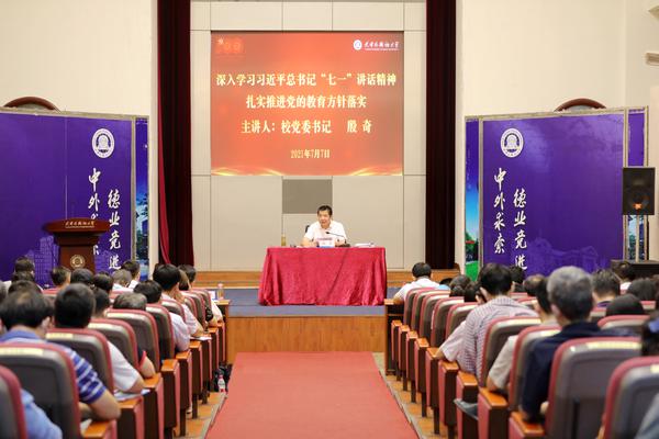 为深入学习贯彻习近平总书记在庆祝中国共产党成立100周年大会上的重要讲话精神, 推进党史学习教育进一步走深走实,按照中央、市委的统一部署,市教育两委关于党史学习教育的工作要求,7月7日上午,校党委书记殷奇在钟楼报告厅以“深入学习习近平总书记‘七一’重要讲话精神 扎实推进党的教育方针落实”为题讲授党课。市教委学生处处长杨明及相关同志出席,校院两级理论学习中心组成员参加党课学习。校党委副书记、校长陈法春主持。 殷奇围绕习近平总书记“七一”重要讲话精神,聚焦党的教育方针的历史变迁、新时代党的教育方针的丰富内涵和如何贯彻落实党的教育方针等方面,全面阐释了学习贯彻党的教育方针的重大意义。他指出,新时代党的教育方针是党统筹中华民族伟大复兴战略全局和世界百年未有之大变局作出的重大部署,核心是围绕“培养什么人、怎样培养人、为谁培养人”这一最具战略决定性意义的根本问题,规定了教育的性质、目标、任务和实现路径,是我们在加快推进教育现代化、建设教育强国新征程中所必须坚守的行动指南。 他强调,全校各级党组织要把学懂、弄通、悟透、做实习近平总书记“七一”重要讲话精神作为当前和今后一个时期的重大政治任务,迅速掀起