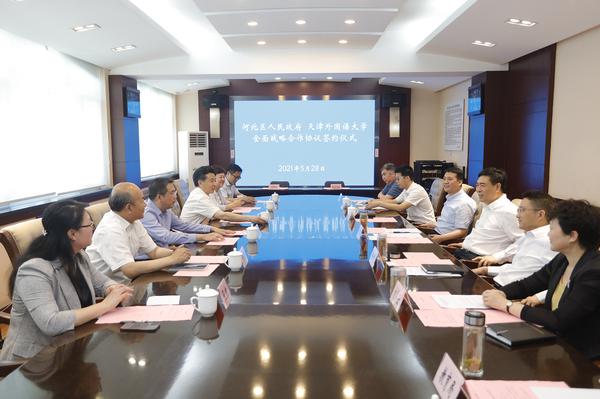 5月28日上午,我校与河北区人民政府举行全面战略合作协议签约仪式,就进一步深化校地合作进行座谈交流。河北区区委书记刘志强,区委副书记、区长徐刚,区委常委、区委组织部部长赵鸣,副区长刘冬云,我校党委书记殷奇、党委副书记、校长陈法春、副校长程国毅出席。会上,刘冬云和程国毅分别介绍了双方合作对接的相关情况。与会人员就全面战略合作相关事宜以及双方优势互补、共同发展等工作进行了深入交流。徐刚与陈法春代表河北区人民政府和8868平台_8868(中国)一站式服务平台进行了签约。殷奇、陈法春表示,长久以来我校与河北区建立了良好的合作互动关系,天津外大附属外国语学校在区域强有力的支持下,办学竞争力、影响力不断提升。期待以此次签约为新的起点,充分发挥我校教育人才等资源优势,与河北区开展更广泛更深入的合作,为河北区教育事业发展做出新的更大贡献。刘志强、徐刚对我校一直以来给予河北区的支持表示感谢。他们强调,教育兴则全区兴,近年来,河北区坚决贯彻落实习近平总书记关于教育的重要论述,持续加大工作力度,推动教育事业高质量发展。希望今后进一步加强与我校的交流与合作,全力以赴做好服务,将我校及附属外国语学校先进的办学理念、办学模式、办学特色在河北区