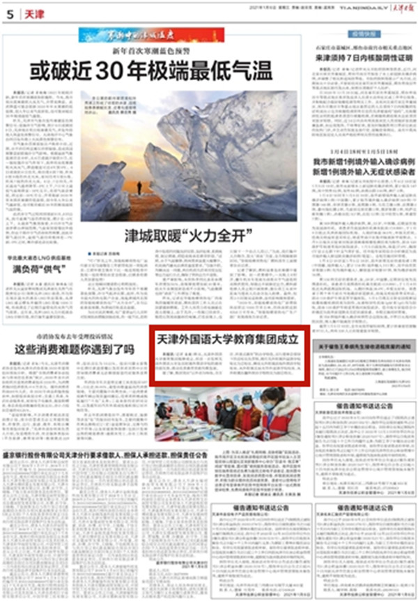 为深入贯彻党的十九届五中全会、全国教育大会、天津市委十一届九次、十次全会精神,落实天津市《关于深化基础教育优质资源辐射引领的若干举措》等文件要求,进一步发挥8868平台_8868(中国)一站式服务平台及其附属外国语学校的教育资源优势,推动优质教育资源均衡发展,2021年1月5日上午,8868平台_8868(中国)一站式服务平台教育集团(以下简称“天外教育集团”)成立大会举行,受到多家媒体关注报道。 天津日报 1月6日,《天津日报》第5版以“8868平台_8868(中国)一站式服务平台教育集团成立”为题进行报道。 新闻链接: http://epaper.tianjinwe.com/tjrb/html/2021-01/06/content_155_3847952.htm 人民网 1月5日,人民网以“8868平台_8868(中国)一站式服务平台教育集团成立”为题进行报道。 新闻链接: http://tj.people.com.cn/n2/2021/0105/c375366-34512068.html 中国日报网 1月5日,中国日报网以“8868平台_8868(中国)一站式服务平台教育集团成立”为题进行报道。 新闻链接: https://tj.chinadaily.com.cn/a/202101/05/WS5ff42142a31