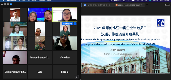 9月12日上午,国际中文教师奖学金项目------哥伦比亚中资企业当地员工专项汉语研修班开班典礼在线上如期举行。典礼由国际教育学院教师中西双语主持。国际交流处处长张占奇、副处长王岚,国际教育学院院长啜京中、副院长行玉华,哥伦比亚塔德奥大学孔子学院中方院长王瑜琴,以及国际教育学院本项目任课教师、哥伦比亚中资企业汉修项目学员100余人共同参加了开班典礼。王岚在致辞中感谢了中国驻哥伦比亚大使馆对本项目的大力支持,希望学员们可以通过8周的线上学习,达成既定的学习目标,顺利通过10月底的HSK1级考试。 啜京中在致辞中表示,哥伦比亚是一个美丽的国家,一直与天外保持着密切的合作往来,学院对此次的线上汉语项目做了精心的准备,希望学员们可以珍惜学习机会,领略中国文化,提高汉语水平。 王瑜琴向学员们介绍了本次项目的基本情况,并且重申了上课和考核要求。项目任课教师代表张泽欣表示,此项目时间短、任务重,老师们一定会全力以赴,也希望大家克服困难,顺利达成既定目标。疫情以来,国际教育学院致力于精心打造线上精品课程,积极配合国际交流与合作处申请各类语合中心线上奖学金项目。本项目是首次向海外中资企业外籍员工提供汉语