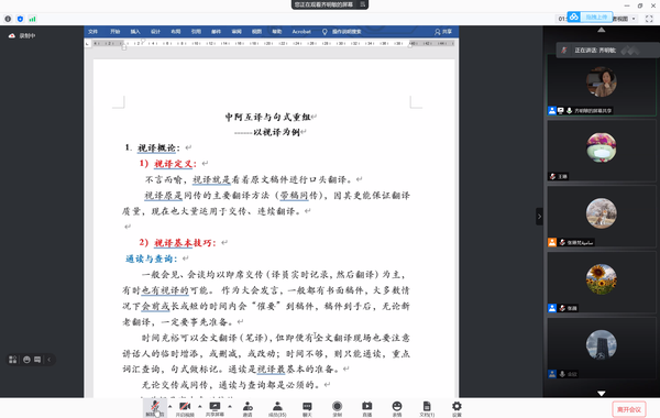 4月30日,北京外国语大学阿拉伯学院齐明敏教授应邀作题为《中阿互译与句式重组------以视译为例》的专题讲座。本次讲座通过腾讯会议进行,我校阿拉伯语语言文学及笔译专业全体师生参加。讲座由亚非语学院副院长金欣主持。齐明敏从视译的概论出发,阐述了视译的基本定义及步骤,并结合自身翻译经验,重点介绍了在中阿互译中句式重组的基本技巧。通过大量翻译举例,详细阐释了截句、并句、增补、转译、重复、重置语序、做标记等翻译方法的应用。讲座将方法阐释与实操练习相结合,令在场师生获益良多。齐明敏强调,作为译者要夯实基本功,了解原文的主旨思想,深入解读其内涵外延,经常进行翻译练习,使翻译技巧融会贯通,才能在翻译过程中得心应手,使译文自然、通顺、完整达意。讲座结束后,齐明敏还与师生们就中阿互译及阿语教学问题进行了深入交流,对提出的问题一一进行详细解答。师生们受益匪浅,收获颇丰。(通讯员:王琳)