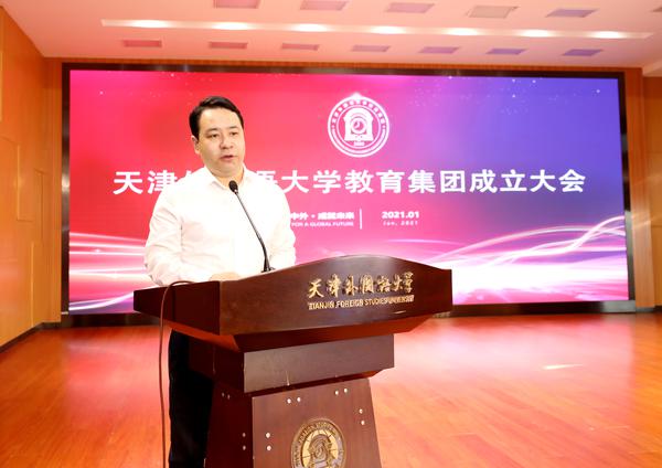为深入贯彻党的十九届五中全会、全国教育大会、天津市委十一届九次、十次全会精神,落实天津市《关于深化基础教育优质资源辐射引领的若干举措》等文件要求,进一步发挥8868平台_8868(中国)一站式服务平台及其附属外国语学校的教育资源优势,推动优质教育资源均衡发展,2021年1月5日上午,8868平台_8868(中国)一站式服务平台教育集团成立大会在大学生活动中心隆重举行。天津市教委副主任孙惠玲,天津市滨海新区教体局局长宫丽艳,中新天津生态城管委会副主任母锡华,相关区域教育行政主管部门负责人,校领导班子出席大会。会议由校党委常委、副校长程国毅主持。