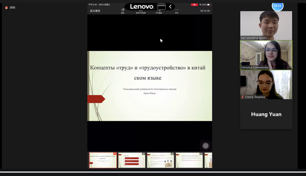 姜雅明以“中国七大方言的特点及其文化内涵”为题作主旨发言,从发音、词汇、句式等层面举例介绍中国地方方言的特点,并详细阐述了中国方言文化的内涵,受到与会专家及其线上受众的广泛好评。分组讨论环节,我校19名硕士博士研究生逐一做交流发言,报告主题丰富多样,分别从中国的婚姻文化、阴阳文化、方言文化、饮食文化等不同方面介绍了博大精深的中国优秀传统文化。其中丰盈发同学的发言内容和良好的俄语表达赢得了国内外师生的一致认可。大家纷纷表示参加本次国际学术会议受益匪浅,为拓宽学术视野、了解学术前沿、提高研究能力提供了良好的学习机会。