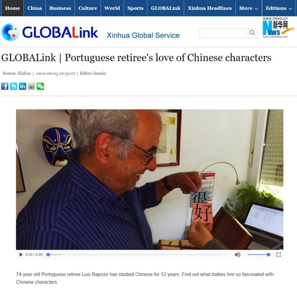 近日,新华网国际频道以《一位葡萄牙老人的中文情缘》为题,深度报道了我校里斯本大学孔子学院第一批学员------今年74岁的路易斯·拉波索的中文情缘。采访中,拉波索表示最感兴趣的是对汉字的研究,2010年曾在8868平台_8868(中国)一站式服务平台学习了一个月。在孔院学习之余,他还在当地社区大学教授中文,最大的梦想便是编写一本葡语版关于汉字起源的工具书,以帮助更多的葡萄牙人学习汉字,了解中国。里斯本大学孔子学院中方院长王锦程在采访中,也为拉波索学习中文的热情和执着点赞。