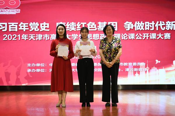 为深入贯彻落实习近平总书记在党史学习教育动员大会重要讲话精神,大力发扬红色传统、传承红色基因,激发青年学生对中国共产党百年辉煌的思想认同、政治认同、情感认同,6月20日,由市委教育工委、市教委主办的“学习百年党史、赓续红色基因、争做时代新人”2021年天津市高校大学生思想政治理论课公开课大赛(普通高校组)决赛在我校大学生活动中心成功举办。校党委副书记胡志刚、市委教育工委学生思想教育与管理处二级调研员赵蓓出席,本市15所高校思政课专家、学生参赛团队、师生代表120余人参加活动。经过激烈角逐,我校郭力娇学生团队和天津师范大学王林玉学生团队最终斩获一等奖。