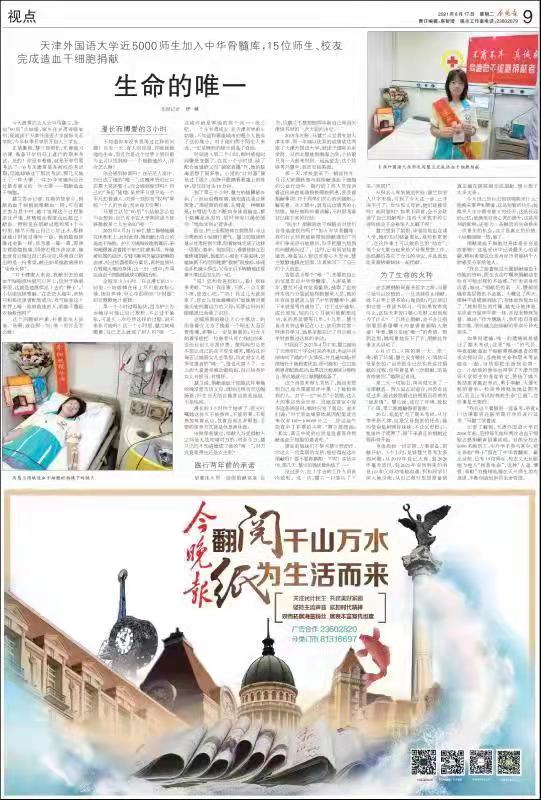 8月17日,《今晚报》专版以《生命的唯一------8868平台_8868(中国)一站式服务平台近5000师生加入中华骨髓库,15位师生、校友完成造血干细胞捐献》为题,深度报道了我校国际关系学院马慧兰同学捐献造血干细胞的感人故事。