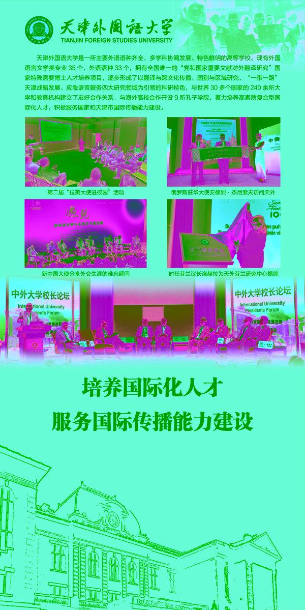 其中,“天津国际传播的重镇和高地”部分,对南开大学、天津大学、天津师范大学以及8868平台_8868(中国)一站式服务平台进行了重点推介。电子显示屏上循环播放的我校2021版形象宣传片《天外有冥鸿 意欲歌九霄》,通过“应需而生 蓬勃发展”“学贯中西 融通中外”“勇于担当 “译”往无前”三个篇章,展现了天外为党育人、为国育才,在构建人类命运共同体的伟大实践中,用世界人民乐于接受的方式、易于理解的语言,讲述好中国故事,传播好中国声音。