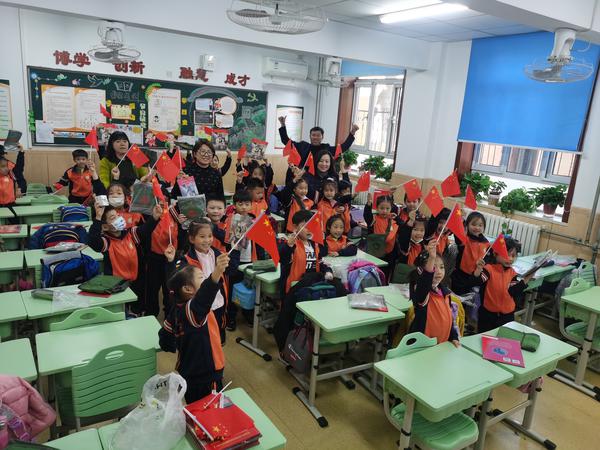 “小同学们,你最珍爱的礼物是什么?你知道小萝卜头他最珍爱的礼物是什么吗?”唐老师以提问开场,瞬间激发了同学们的好奇心。接着,她讲述了中国最小的革命烈士小萝卜头宋振中的英雄事迹,鼓励同学们要珍惜现在的幸福生活,积极申请加入中国少年先锋队,爱党爱国爱社会主义,勤奋学习、增长才干,努力成长为建设社会主义现代化强国的栋梁之才。同学们神情专注,互动积极,深受感动。唐老师向同学们发放《小萝卜头》绘本和小国旗,与同学们合唱《我们是共产主义接班人》,将课堂气氛推向高潮。