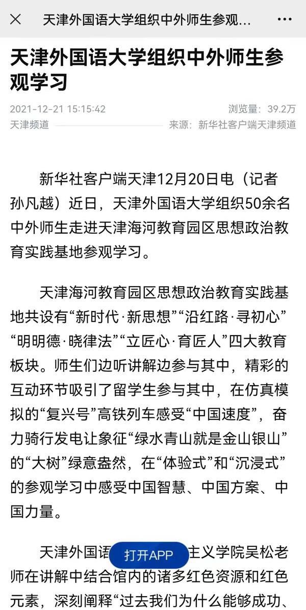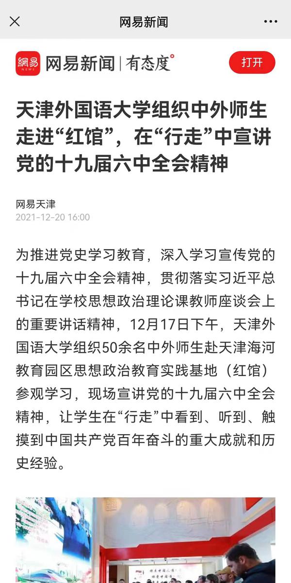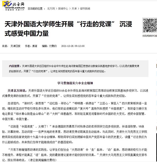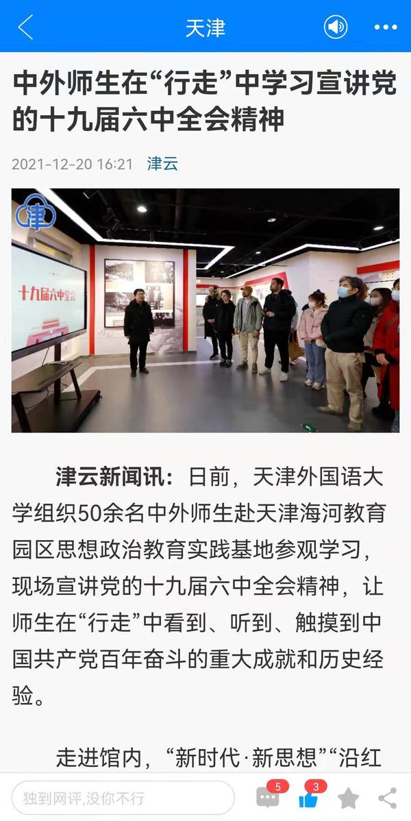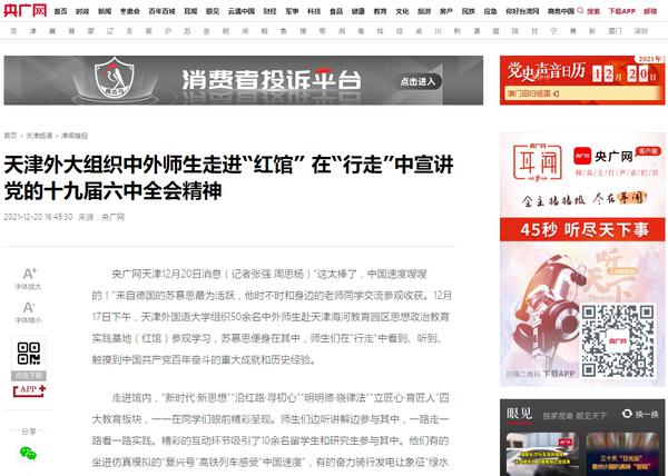央广网以《天津外大组织中外师生走进“红馆” 在“行走”中宣讲党的十九届六中全会精神》为题进行了报道。