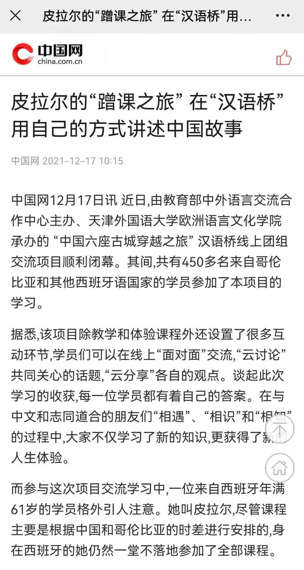 日前,由教育部中外语言交流合作中心主办、我校欧洲语言文化学院承办的“中国六座古城穿越之旅”汉语桥线上团组交流项目顺利闭幕。来自西班牙的“特殊学员”皮拉尔接受记者采访,讲述了其与中国奇妙的缘分,以及对中国文化浓厚的兴趣。中国日报网、中国网对其进行了报道。
