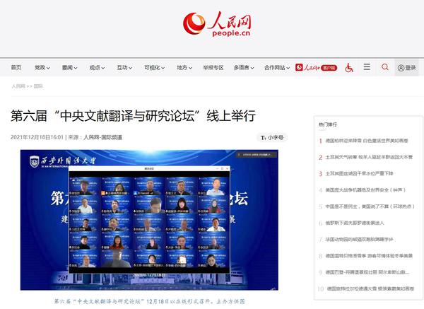 12月18日,第六届“中央文献翻译与研究论坛”以在线形式召开,以“建党百年与对外话语体系建设:成就、挑战与发展”为主题,聚焦做好对外话语体系建设工作,开展多学科研讨,进一步提升中央文献对外翻译服务党和国家中心工作的能力。人民网-国际频道对此进行了报道。