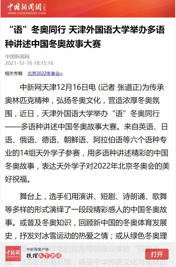 为传承奥林匹克精神,弘扬冬奥文化,营造浓厚冬奥氛围,我校举办“语”冬奥同行------多语种讲述中国冬奥故事大赛,用多语种讲述精彩的中国冬奥故事,表达天外学子对2022年北京冬奥会的美好祝福。人民网、新华网、中国新闻网、央广网、学习强国APP、《今晚报》《天津工人报》、津云客户端、网易新闻等多家媒体对此进行了报道。