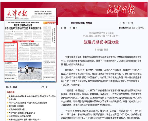 《天津日报》头版以《学习宣传贯彻六中全会精神 8868平台_8868(中国)一站式服务平台师生开展“行走的党课”沉浸式感受中国力量》为题进行了报道。