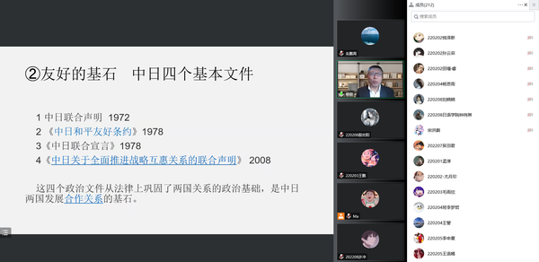为了引导2022级新生、2021级学生深入了解日语学科现状与发展前景,提升自主学习能力与跨文化交际能力,近日,日语学院特邀我校外国语言文学学科带头人修刚教授以《跨文化交际视域下的中日交流------中日邦交正常化50周年之际的思考与寄语》为题开展线上讲座。讲座由日语学院院长朱鹏霄主持。
