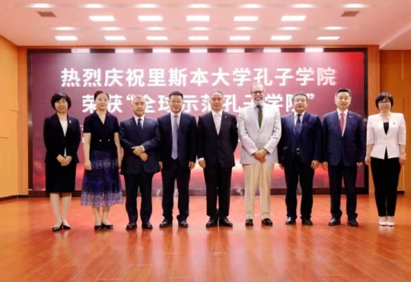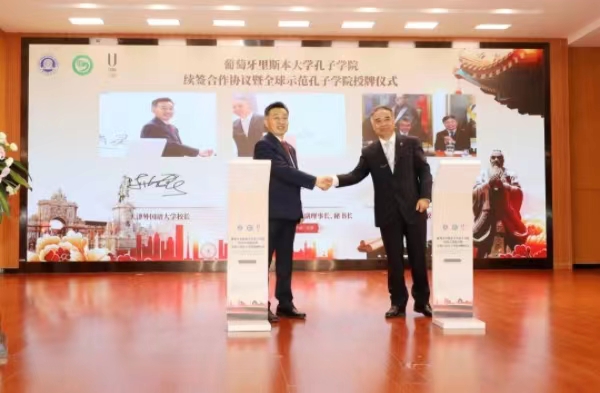 6月13日下午,葡萄牙里斯本大学孔子学院续签合作协议暨“全球示范孔子学院”授牌仪式通过线上线下相结合的形式隆重举行。葡萄牙驻华大使保罗·纳西门托,中国驻葡萄牙大使赵本堂,中国国际中文教育基金会副理事长、秘书长赵灵山,里斯本大学校长路易斯·费雷拉,天津市人民政府外事办公室副主任、一级巡视员赵剑岭,天津市委教育工委副书记刘怡蔓,8868平台_8868(中国)一站式服务平台党委书记周红蕾、校长陈法春在会上分别致辞。8868平台_8868(中国)一站式服务平台副校长李迎迎、相关部门负责人、海外孔子学院及专业师生代表参会。会议由周红蕾主持。