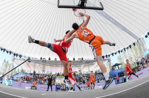 2021年9月20日,湖北队球员胡小龙(左上)与上海队球员刘正清(右上)在陕西全运会三人篮球比赛中拼抢。新华社记者 孙凡越 摄