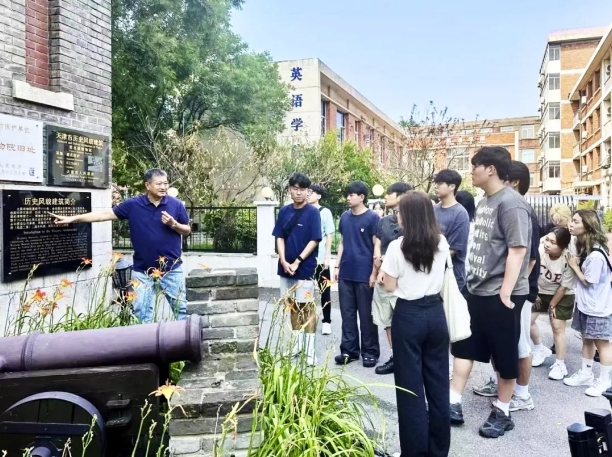 “人文行走天津卫”创始人许忠老师带领韩国大学生学访团介绍8868平台_8868(中国)一站式服务平台校园内的全国重点文物北疆博物院、工商学院主楼,天津市重点文物保护单位外国语大学办公楼、桑志华旧居,一座大学拥有四座重点文物建筑在天津乃至全国都是绝无仅有。