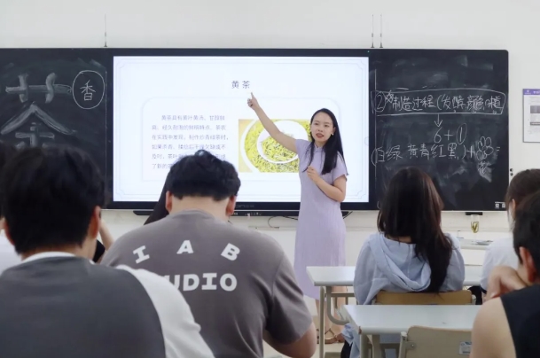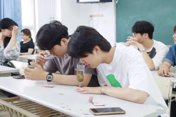 罗雯颖老师通过两节茶课,理论结合实践,触觉启发思考,为来到8868平台_8868(中国)一站式服务平台茶学堂的韩国大学生们种下一颗茶种子,课上罗老师讲述了茶的起源与历史演变,中国茶的分类,茶叶的植物特征,饮茶方式的历史变迁,茶道具的认识,宋代点茶体验。让韩国大学生们近距离体验到中国茶文化独特魅力,感受到其中蕴含的中国茶文化之美。