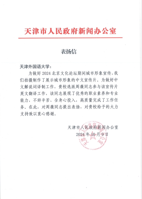 天津市人民政府新闻办公室委托天外翻译在2024年北京文化论坛上展示我市形象的中文宣传片。外译中心副主任周薇高质量地完成了两部宣传片的英文翻译工作,展现了优秀的职业素养和专业能力。