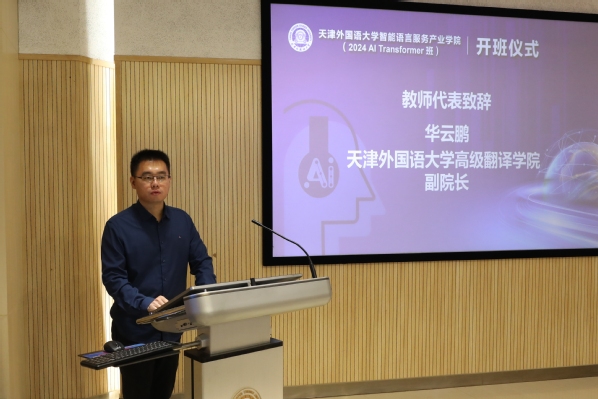 教师代表、高级翻译学院副院长华云鹏在发言中表示,面对人工智能的迅猛发展,我们不仅要掌握扎实的专业知识,更要具备跨学科的视野和解决问题的能力。他鼓励同学们主动拥抱前沿工具,让AI成为人类的“超级助理”,实现AI赋能的华丽变身。