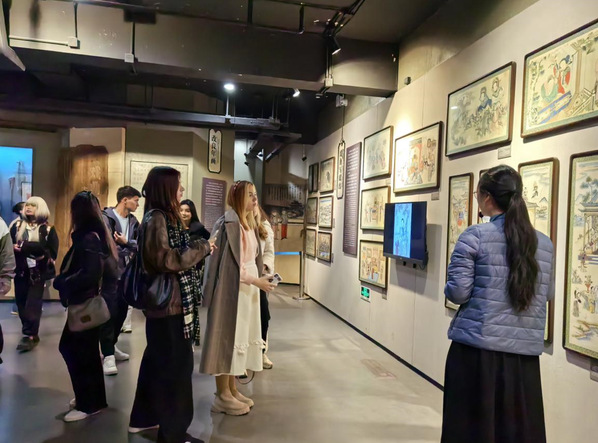 游船从古文化街码头出发,经过一个小时的航行,中午时分抵达西青区白滩寺码头。留学生们在博物馆工作人员的引导下,来到位于杨柳青镇的民俗博物馆,先后参观了馆内的年画展厅、民俗风情展区。在参观过程中,大家对杨柳青年画这一中国传统非遗艺术表现出了浓厚的兴趣。年画以其独特的制作工艺、丰富的色彩、生动的形象和深厚的民俗内涵吸引了众多留学生的目光。来自亚美尼亚的香琳很喜欢中国画,业余时间也经常尝试绘画中国山水画,参观了杨柳青民俗博物馆后,她情不自禁拿起相机频频拍照,对杨柳青年画这门古老的艺术充满兴趣,她说有机会一定要亲自画一幅杨柳青年画,体会传统艺术的魅力,也希望有机会能把自己的年画作品送给家乡的朋友们,让他们都能感受到天津非遗技艺的魅力。