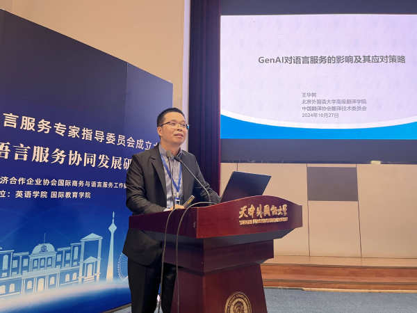 在主旨发言中,北京外国语大学高级翻译学院王华树教授以“AI技术对语言服务的影响”为题,深入探讨了人工智能技术如何改变语言服务行业的现状和未来趋势。他指出,AI技术的发展为语言服务行业带来了革命性的变化。AI技术的应用正在不断拓展语言服务的边界,提高服务效率,同时也对语言服务人才的培养提出了新的要求。
