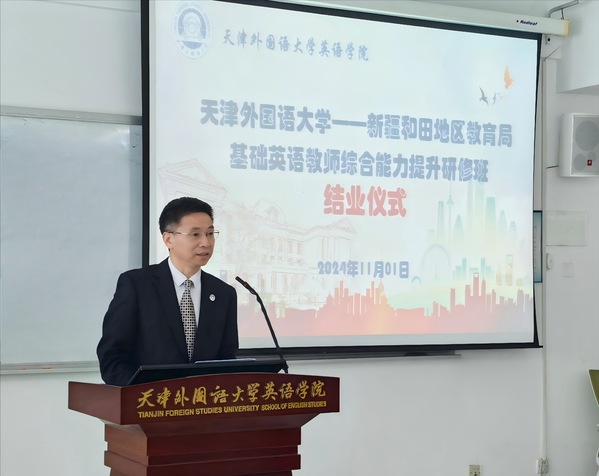 胡志刚代表天外对本次培训取得的良好效果表示充分肯定,对承办单位英语学院精心设计的各项教学活动内容给予了高度评价,并对参训学员展现出的良好精神风貌与职业素养深表赞许。他指出,本次研修班的举办,是深入学习贯彻党的二十届三中全会精神,深刻学习领会习近平总书记关于加强和改进民族工作的重要思想的重要举措,对于促进同少数民族师生广泛交往、交流、交融,铸牢中华民族共同体意识具有重要意义。他希望,全体学员以这次在津交流学习为新起点,继续认真学习贯彻落实习近平总书记在全国教育大会上的重要讲话精神,珍惜人民教师这份荣光,严格要求自己,不断完善自己,执着于教书育人,有热爱教育的定力、淡泊名利的坚守,持之以恒下苦功夫,做到学以致用,把学习成果运用到工作实践,为新疆和田地区教育事业建设做出更大贡献。