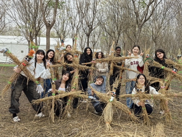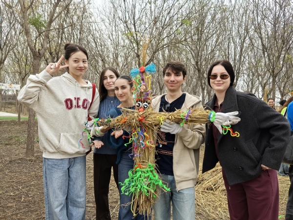 亚美尼亚留学生米克(右二)制作的稻草人非常有特色,大家纷纷合影