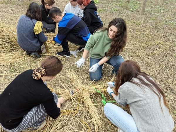 此外,活动现场,留学生们两两一组,在专业老师的指导下,认真学习了如何扎制稻草人。从选取稻草、捆绑成型到装饰打扮,每一个步骤都充满了挑战与乐趣。留学生们分工明确,有的负责捆绑稻草,有的负责编织稻草,还有的则忙着给稻草人穿上“花衣服”。尽管过程中遇到了不少困难,但在大家的共同努力下,一个个形态各异的稻草人逐渐在田间“站”了起来。