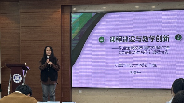 来自天外英语学院的教师李昊平以备赛全国高校教师教学创新大赛为主线,以《英语批判性写作》课为例,重点分享了“如何建设好一门课”的经验。