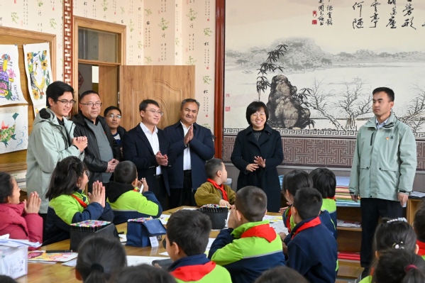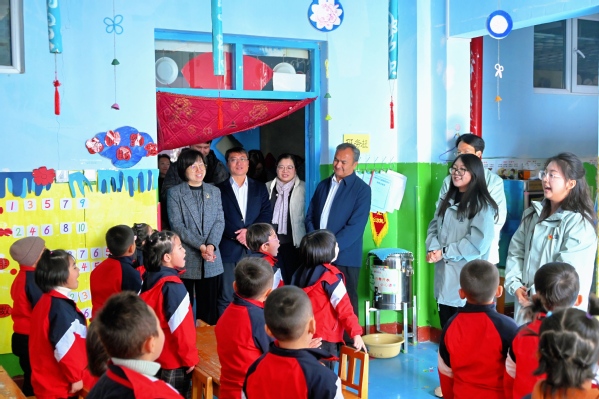 周红蕾一行深入走访天外在于田县援助的第一中学、第四幼儿园,细致考察了支教团的课堂教学以及课后兴趣社团的实况,了解支教团课程教学开展情况以及与当地合作开展民族交融、情感交流的特色活动的进展,参观了富有意义的心愿树与感恩墙,并为50名达成心愿的学生代表赠送了心愿礼物,希望感恩情怀植根于少数民族学生的心田。