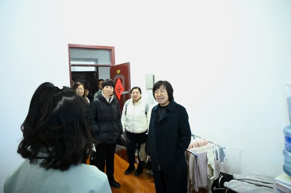 周红蕾一行来到支教师生驻地公寓,实地走访了宿舍、食堂,切身感受支教团的住宿条件与生活环境,并为队员们发放慰问品,与师生们在驻地食堂共进晚餐。
