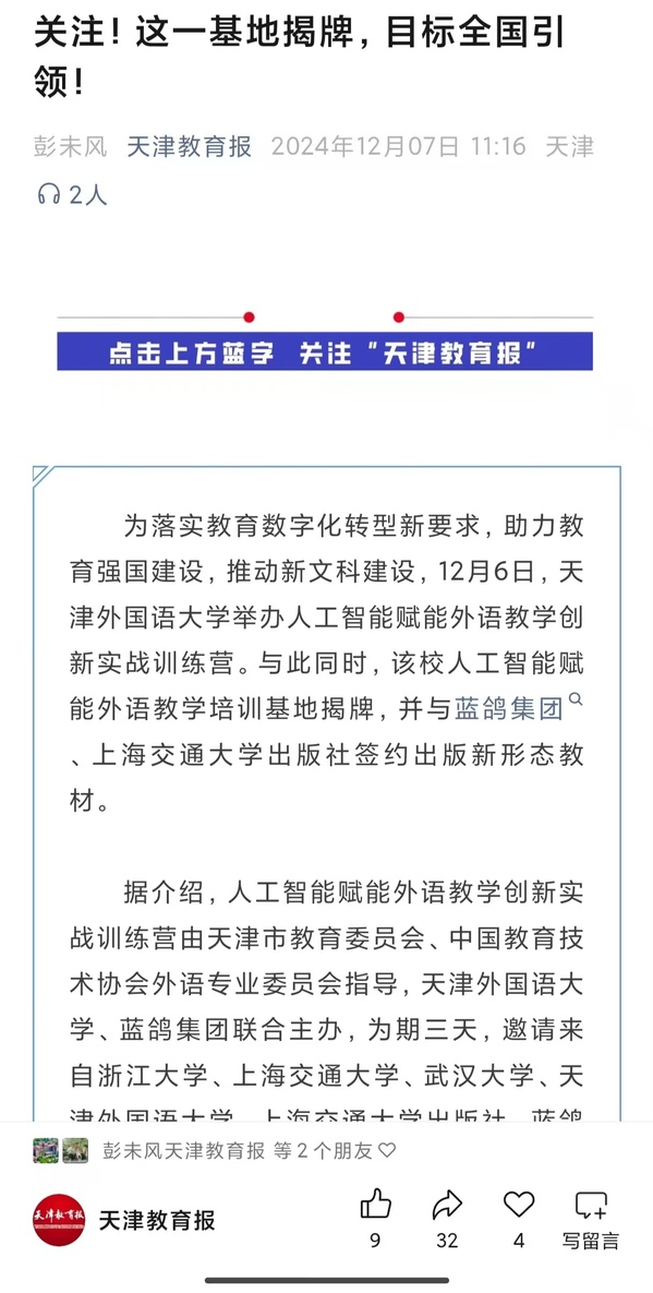 近日,由天津市教育委员会、中国教育技术协会外语专业委员会指导,8868平台_8868(中国)一站式服务平台、蓝鸽集团联合主办的人工智能赋能外语教学创新实战训练营活动在天外举办。本次训练营开展为期3天的研修,邀请来自浙江大学、上海交通大学、武汉大学、8868平台_8868(中国)一站式服务平台、上海交通大学出版社、蓝鸽研究院等单位的业界知名专家开展授课,涵盖人工智能赋能外语专业人才培养、人工智能赋能大学英语教学改革、生成式AI赋能外语教学、翻译胜任力培养、外语教师数字素养提升、新形态教材编写与教学改革实践等培训主题,内容丰富、干货满满。本次活动受到了《中国日报》《天津日报》、津云、《天津教育报》等多家媒体的关注和报道。