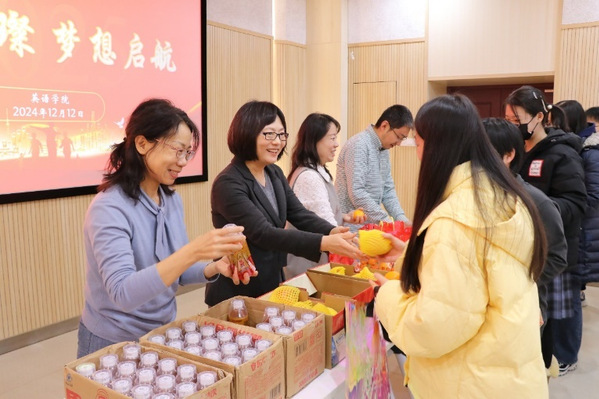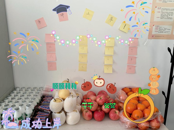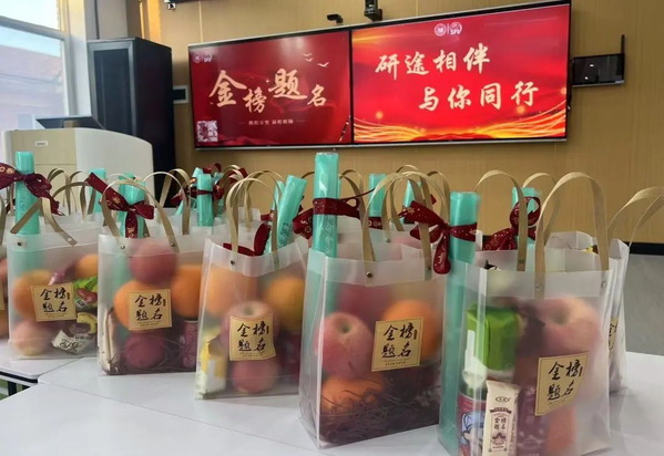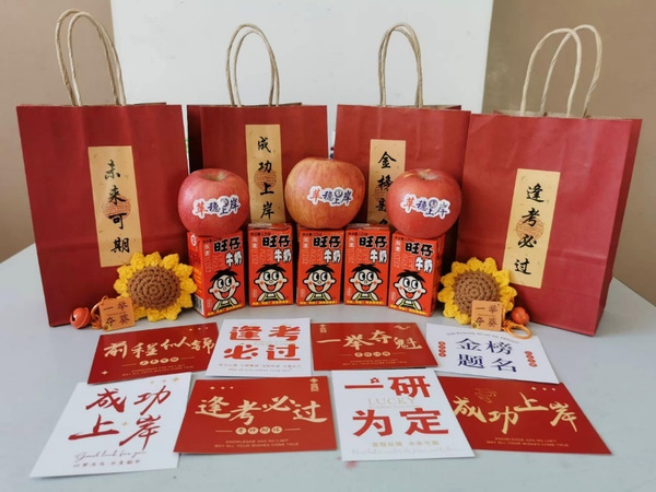 考前,天津外大英语学院举办“研途璀璨,梦想启航”考研加油活动,通过播放暖心加油视频、发放考研加油礼包、分享备考经验、书写心愿卡等形式助力考研学子顺利通过考试。考研加油礼包不仅包含了考研必备的文具用品,还有寓意祝福的水果——沃柑和苹果,祝考生们“百尺竿头,更进一步”“苦尽甘来”“平安顺利”“平步青云”。