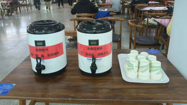 考试期间,学校各食堂设立考研休息区,方便考生休息;公寓食堂、校内学生食堂推出“蒸蒸日上”“前程似锦”“一举夺魁”等冬日考研暖心套餐,为考生鼓劲加油。A座商贸区、心园餐厅推出优惠活动;各食堂增加门帘、坐垫等保暖措施,推出姜丝红糖茶、热橙汁等免费热饮,为考生送上冬日温暖。