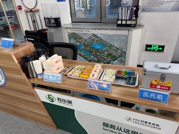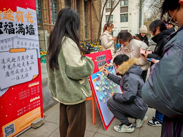 考试当天,学校在各考点设立暖心服务台,不仅为考生免费提供2B铅笔、签字笔、电池、橡皮、医药箱等应急物品,还特别为有需求的师生准备了糖果、小食品、纸杯、热水、咖啡、红糖姜茶、纸巾、一次性眼镜清洁湿巾、暖宝宝等物品。服务台还配备了打印机,为考生提供准考证免费打印服务。此外,校内暖心接驳车随时为有紧急需要的考生提供帮助。天津大学学生会、研究生会举办了“‘研‘途有光,祝福满墙”活动,众多热心师生在双校区的多个摊位写下对考研学生的诚挚祝愿,传递温暖与力量。