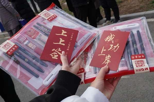 此外,电子与信息工程学院考前为考生们送上了“好运大礼包”,里面装满了真挚的关心与祝福:暖贴——驱散寒意、清凉油——提神醒脑、上岸袜——步步登高、状元笔——妙笔生花、向日葵——一举夺魁、橙子——成功上岸……