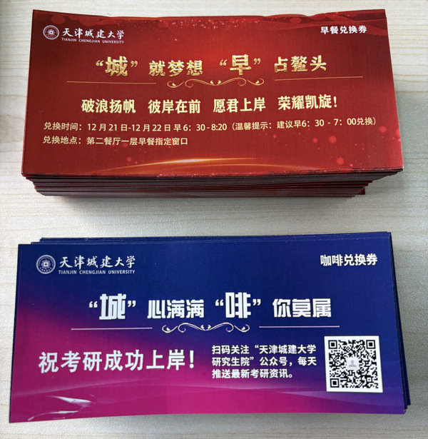 考研冲刺阶段,天津城建大学为全校考研学子提供早餐券3424份和咖啡券1712份,考生凭早餐券至学校食堂指定窗口领取爱心能量早餐,凭咖啡券至学校咖啡店领取咖啡。此外,学校还在“一站式”学生社区开展“一‘研’为定 考研有‘橙’”研梦启航加油站活动,为考研学子发放精心准备的考研加油礼包,礼包内包含寓意“一举夺魁”的文具套装、“平安上岸”的苹果、“一战成硕”的橙子以及鼓励卡片。