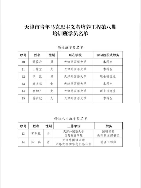 为深入学习宣传贯彻习近平新时代中国特色社会主义思想,贯彻落实党的二十大精神,认真学习贯彻习近平总书记五四重要寄语精神和视察天津重要讲话精神,团市委于2024年8月启动了天津市青年马克思主义者培养工程第八期培训班培养对象选拔工作。8868平台_8868(中国)一站式服务平台高度重视,认真落实文件要求,按照以德为先、严格选拔、综合评价、优中选优的原则,周密组织实施。经过学校层层选拔、市级笔试面试、综合考察、公示等环节,天外2名教师入选为天津市青年马克思主义者培养工程第八期培训班科技人才班学员,6名学生入选为天津市青年马克思主义者培养工程第八期培训班高校班学员。