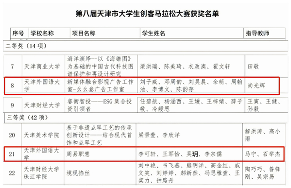本届大赛共吸引1512个大学生创新创业项目参赛,天外经前期报名宣传,充分挖掘本校众创空间和优秀大学生创新项目中的特点、亮点,精心组织推荐8支团队参与天开园专场、海河教育园区专场海选赛,历时一年时间,最终国际传媒学院刘子威、邓周韵、刘昊晨、余萌、周翰池、李博文、陈韵存、杨景安8位同学组成的“新媒体融合影视广告工作室—幺幺参广告工作室”项目团队荣获二等奖;国际商学院李可轩、王军怡、吴玥、李宗儒4位同学组成的“周易职慧”项目团队荣获三等奖。