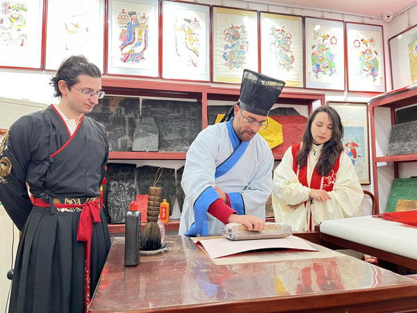 随后,外国友人来到了玉成号年画坊。杨柳青木版年画作为中国民间艺术的瑰宝,以其独特的制作工艺和丰富的题材内容闻名遐迩。在这里,三位外国友人被色彩斑斓、栩栩如生的年画所吸引。在年画师傅的指导下,他们亲自体验了木版年画的制作过程,从选纸、墨线勾勒到色彩套印,每一步都让他们感受到了传统技艺的魅力和匠心独运。这次体验让他们更加直观地感受到了中国文化的独特魅力和中国人民的智慧与创造力,也对中国的传统文化有了更深的理解。