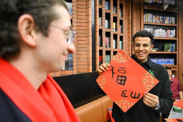 Ahmed mohamed Saleh (L) attends a Spring Festival folk activity at the Zhongshuge Bookstore in Tianjin, north China, Jan. 26, 2025. (Xinhua/Sun Fanyue)