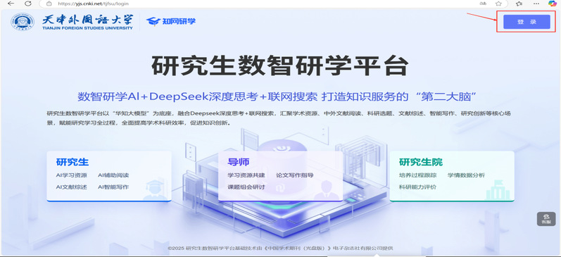 1.打开网址:https://yjs.cnki.net/tjfsu,点击右上角【登录】,注册或登录个人账号,选择学生/教师身份,填写姓名、学号/工号后进入系统,点击左侧导航栏--【研究生数智研学平台】即可体验。