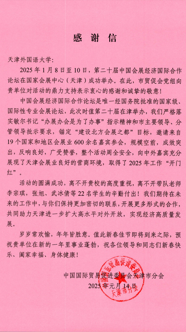 近日,中国国际贸易促进委员会天津市分会商法中心主任蔡颖一行到访我校,并发来感谢信,感谢学校对“第二十届中国会展经济国际合作论坛”的鼎力支持。高级翻译学院党委书记郭芃及相关负责同志出席了会议。