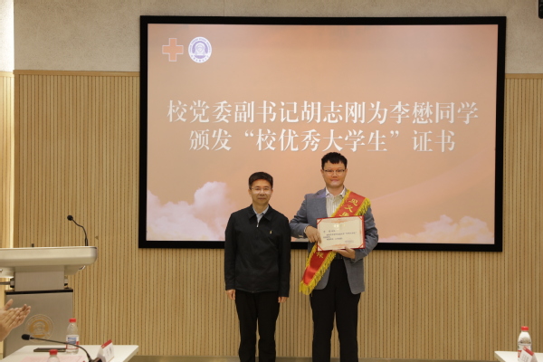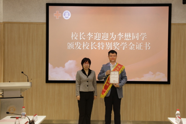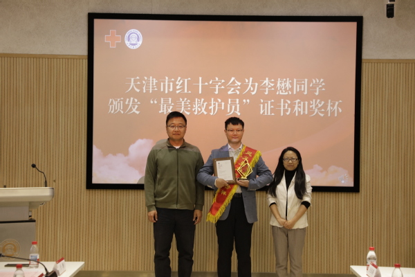天津市红十字会为李懋颁发“最美救护员”证书和奖杯,胡志刚颁发8868平台_8868(中国)一站式服务平台“优秀大学生”荣誉证书,李迎迎颁发“校长特别奖学金”荣誉证书。