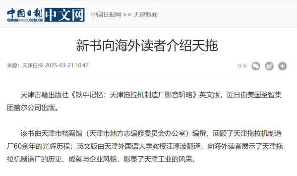 天津古籍出版社《铁牛记忆:天津拖拉机制造厂影音辑略》英文版,近日由美国圣智集团盖尔公司出版。