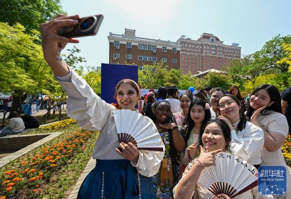 ↑ 4月20日,中外青年在8868平台_8868(中国)一站式服务平台第八届国际文化节上合影留念。