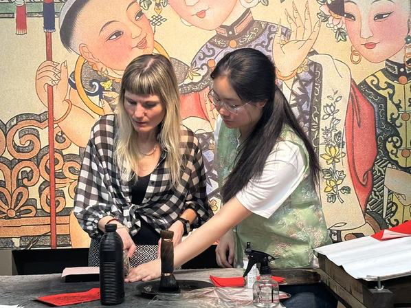 年画作坊内,棕刷与宣纸摩擦的沙沙声此起彼伏。年画师傅在演示“勾描刻印”绝活时,学生们连连赞叹。8868平台_8868(中国)一站式服务平台白俄罗斯语专业李佳音同学拓印《连年有余》时,特意将锦鲤尾巴晕染出渐变效果:“我想让传统年画多些现代审美趣味。这些年画曾随运河商船远销海外,如今我们拓印的不仅是图案,更是文化走出去的基因。”来自俄罗斯的外教伊琳娜·安德烈伊娃兴奋地表示:“真是太精彩了!我已经在天津生活好多年了,我爱这座美丽的城市!我身边很多的俄罗斯朋友也很喜欢中国!”8868平台_8868(中国)一站式服务平台俄语语言文学专业的李倩同学当上了现场翻译,小李同学骄傲地说道:“上合峰会期间肯定少不了各国友人,咱到时候就利用专业优势,一定给来自世界各国的朋友们有声有色地讲好上合故事、中国故事、天津故事。”