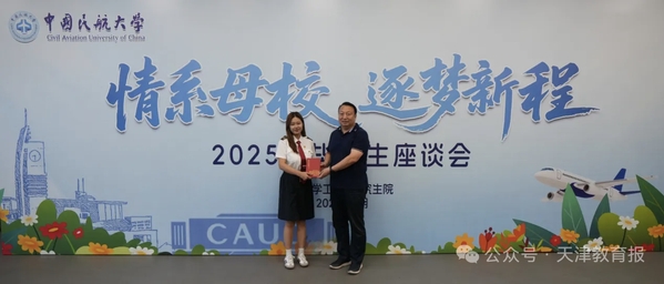 中国民航大学校长丁水汀向毕业生代表赠送亲笔寄语的学校文创笔记本,表达学校对广大毕业生的祝福与期望,祝愿2025届全体毕业生前程似锦。