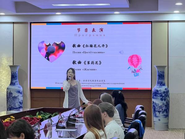 俄语系卢怡宁同学用中俄双语演唱了歌曲《红梅花儿开》和《茉莉花》,既展现了天外学子的专业风采,也让俄罗斯友人通过艺术形式感受到了中华文化的独特魅力。